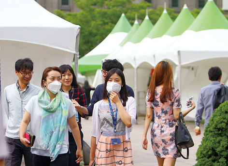 6月2日,在韩国首都首尔,市民戴着口罩经过市厅广场。近来韩国民众对MERS的担忧进一步加剧,街头戴口罩的民众明显增多。(资料图)