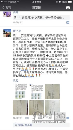 “安徽籍3岁小男孩,不慎被开水烫伤,病情危急,随时都有生命危险,因家庭贫困,在此呼吁万能的朋友圈,献出你们的爱心,救救可怜的小男孩……”烧伤科的医院人员迅速在各自的朋友圈发出爱心救助微信。随即,爱心救助微信一传十、十传百、百传千,一条条爱心救助正能量很快在医院上下,在温州大地迅速散播开来。