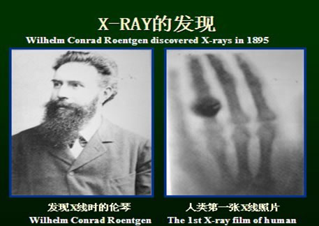 在1895年12月的一个夜晚,德国一位世界著名的物理夜学家伦琴在物理实验室中发现:放电的玻璃管不仅发射看得见的光,还发射某种看不见的射线,这种射线穿透力很强,能穿透玻璃、木板和肌肉等,也能穿透黑纸使里面包着的底片感光,还能使涂有氰酸钡的纸板闪烁浅绿色的荧光,但对骨头难以穿透。他认为新发现的射线本质很神秘,称之为“X射线”。它实质上是一种光子流,一种电磁波,具有光线的特性,由于X射线能量很高,所以能穿透一定厚度的物质。能量越高,能穿透的物体越厚,因此在医学上能用来透视、拍片和进行放射治疗。