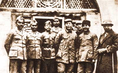 毛泽东与印度援华医疗队成员巴苏华(左一)、柯棣华(左二)、 木克华(左四)、爱德华(右二)、卓克华(右一)等人合影。