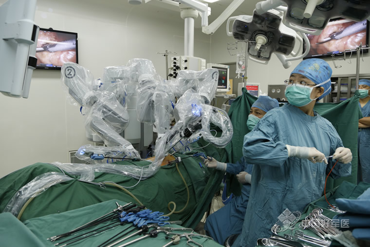 活体小肠移植手术需要多组医生的精密协同,出不得一点差错。手术分为三组,一组实施供体小肠切除,一组实施受体移植,一组实施灌洗。对于供体的手术,传统的办法需要在腹部切个大口子,手术操作虽然并不复杂,但精细程度不够,术后恢复相对慢一点。这次手术选择的是目前国际上最先进的达芬奇机器人,只需要在供者腹部开几个小洞,插入细细的机器臂进行仔细分离,待拟移植的小肠准备妥当之后,再在腹部开个小口子取出小肠,灌洗干净后与受者的血管及肠管接合。据吴教授讲,国内外有利用机器人取肝取肾的,但从没有取小肠进行移植的尝试。