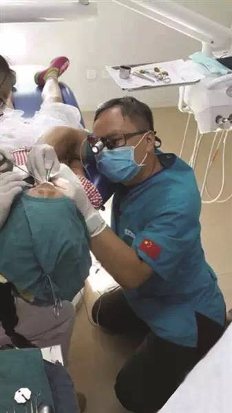 根据报道,这位9岁患儿因为牙齿受外伤穿孔,出现慢性炎症导致畸形发育,病情十分复杂,需要手术治疗,但手术区域大约5毫米,且在腭侧拐弯的地方,平常手术用的显微镜照不到,只能头戴镜子来操作,这样医生的眼睛就要和孩子的牙齿保持平行状态,只能采用卧姿或跪姿。