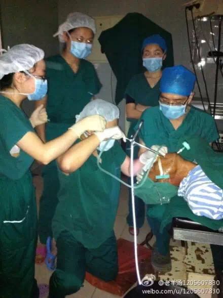 由于是临时的紧急手术,患者躺在那里,离地大约70厘米,不高也不低。医生要取异物时,不好操作,站起来,看不清里面的异物,坐着更看不到,所以只好跪着手术。