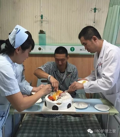 “祝你生日快乐!祝你生日快乐!”口腔颌面外科军人病房里传来了一阵阵欢乐、温馨的歌声。苏凤花护士长、任常群副主任、经治医生李勇、责任护士黄主宝及同病房的病友们为虞磊点燃生日蜡烛,纷纷送上祝福。烛光下,虞磊的脸上洋溢着幸福的笑容。他激动地说:“谢谢你们给我过了一个温馨又难忘的生日,谢谢你们的祝福,让我在医院也感受到了家的温暖。”点亮烛光,点亮关爱。护士长对笔者说,为病人营造一个温馨、安全、舒心的病区环境,把爱心奉献给病人,用真情感动病人,这就是优质护理服务的基础内涵。