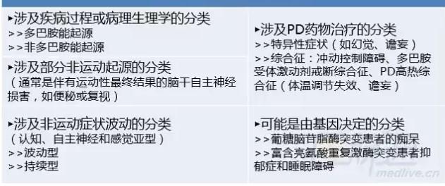 PD广泛的神经病理学变化,可使患者出现从胃肠道功能紊乱到睡眠障碍、从认知障碍到情感淡漠和抑郁等的广泛症状。此外,一些症状还与患者的药物治疗有关。