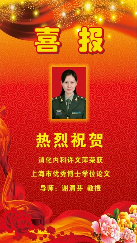 日前,上海市教育委员会、上海市学位委员会公布了2015年上海市优秀博士、硕士学位论文名单,上海长征医院消化内科许文萍荣获上海市优秀博士学位论文。