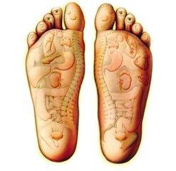 将一只足抬高到另一条腿的膝盖上,足内翻,足心向着自己,在手上和足心上涂一些按摩膏或护肤软膏,用拇指在足心部位做深的转动按摩,开始的区域在足趾后面、逐渐移向足跟,在每一个区域要按摩一定的时间。当足心按摩完毕,转到足背按摩,仍用拇指,方法同样是从一个点按摩到整个足背。足背按摩结束后,再按摩足趾,对每一个足趾进行缓慢的、轻轻的牵拉,并转动按摩它的每一侧,从近心端向远心端按摩,再做足趾的屈曲伸展活动。然后,在另一只足重复这些手法。
