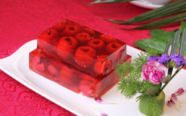 放入保鲜冰箱降温至稠状时取出待用(山楂糕温度控制在15度左右,鱼胶汁温度控制在20度左右),取器皿,内壁涂抹橄榄油控干,放入切好形状的山楂糕,然后顺碗边慢慢倒入加工好的鱼胶汁,放保鲜冰箱降温待用!食用时可酌情加入蜂蜜调味!
