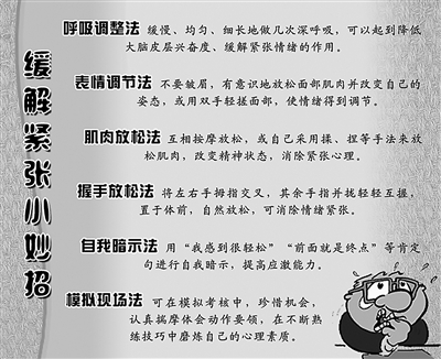 表情调节法。第一次参加室内技能考核,考核场上严肃的气氛令人压抑,许多新战友都容易过分紧张,考核成绩往往不如训练成绩。当情绪过分紧张时,有意识地放松面部肌肉并改变自己的姿态,不要皱眉、握拳,两手应张开,或用双手轻搓面部,使肌肉放松。对训练或考核的结果不满意,情绪低落时,最好看看别人的笑脸,以使情绪得到调节。