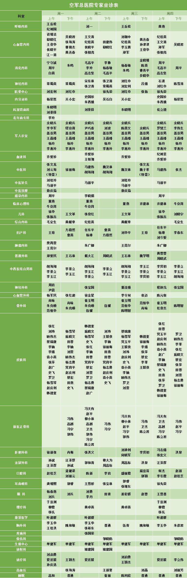 空军总医院专家坐诊表