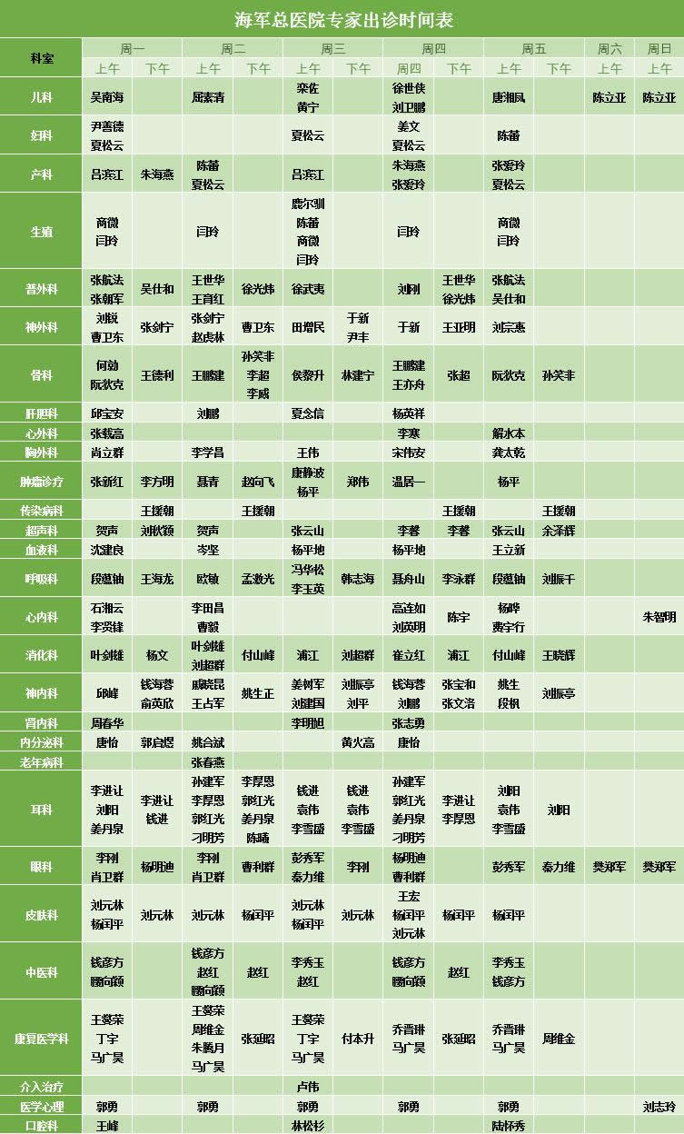 海军总医院专家坐诊表