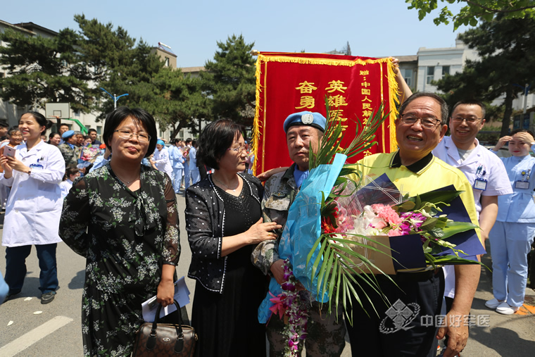 七旬老军医刘永灿(右一)携老伴向医院赴马里维和医疗队敬献锦旗,并与其儿子(右二)、第463医院普外科副主任、赴马里维和医疗队员刘劲松激动地留影。