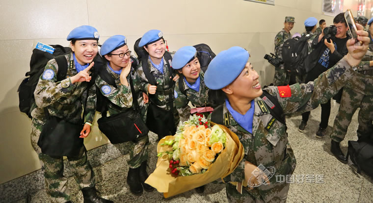 中国第四批赴马里维和部队第一梯队18日晚凯旋,医疗分队队员李娜(左二)、张杰(左三)与战友们在等待回家列车的站台上留影。