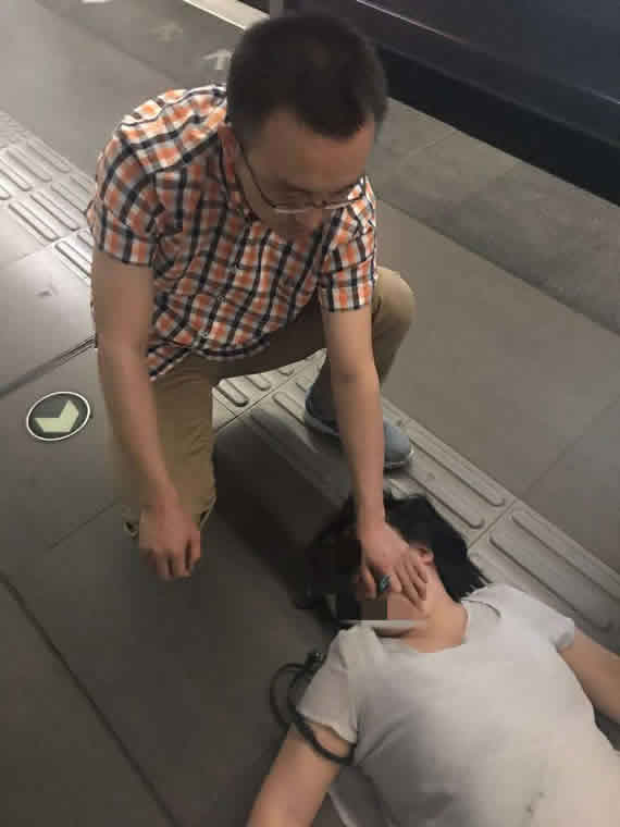 争分夺秒的生死抢救,经历了惊心动魄的6分钟。在地铁列车停站间隙,袁新普和周围乘客把刘女士抬下地铁列车,平放在站台上。经过及时处理后,此时刘女士意识、呼吸平稳,能微微睁开眼。
