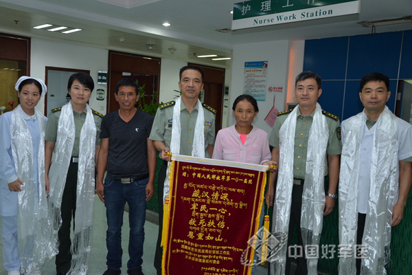 9月6日,在无锡联勤保障中心第101医院普外科三区护士站台前,即将出院的西藏米林县卧龙镇藏族患者曲吉,将洁白的哈达和写着“藏汉一家亲”的锦旗敬献给医护人员,以表达他们一家深深的谢意。