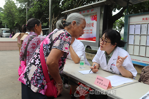 图为老年病科副主任陆秀红为93岁高龄的何记娇义诊