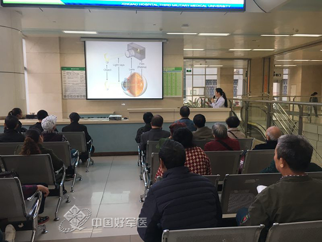 新桥医院门诊大厅,医生正在眼疾知识讲座