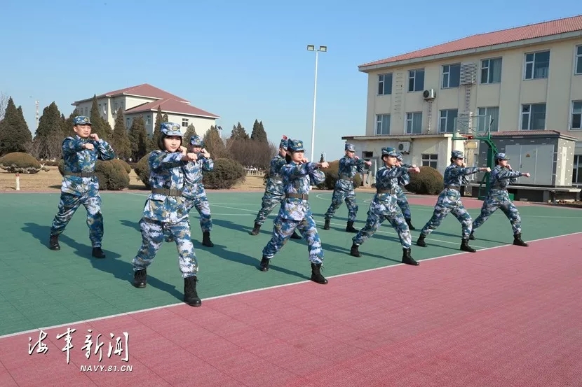 ▲话务女兵学打军体拳。