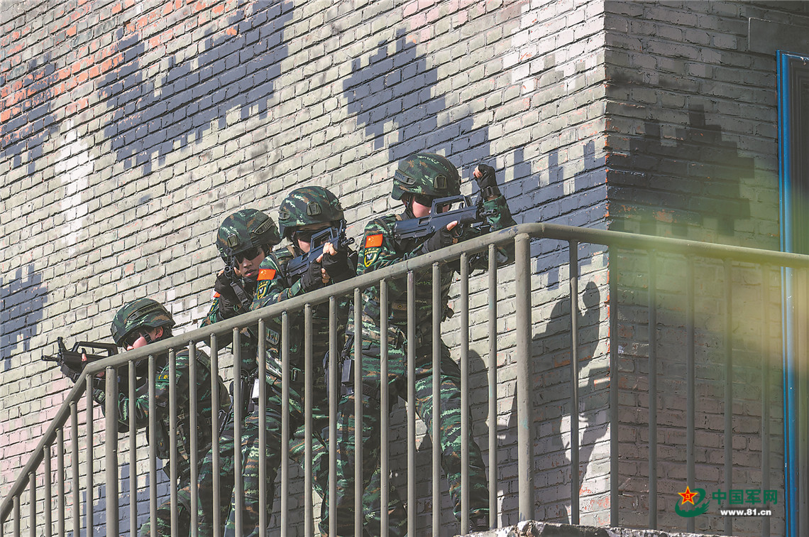 突击小组搜索建筑物内的“暴恐分子”。