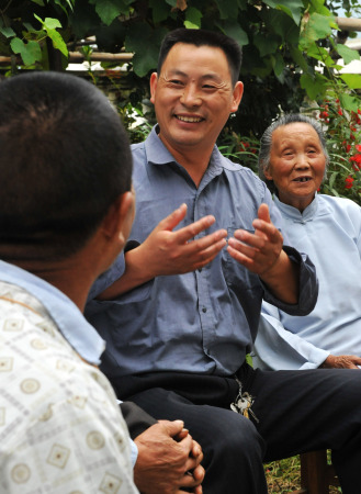 8月23日,刘磊在“板舍五保老人之家”和老人们聊天。