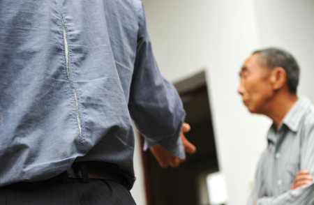 8月23日,刘磊穿着破旧的衬衫和五保老人聊天。
