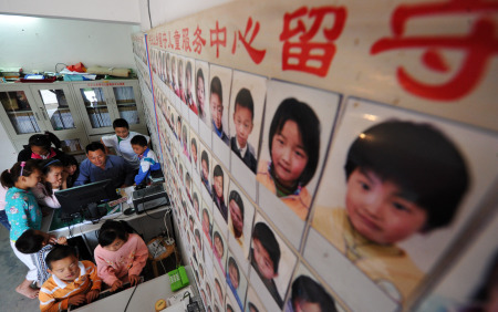 8月23日,刘磊在教留守儿童服务中心的孩子们上网。