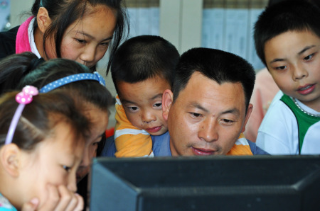 8月23日,在留守儿童服务中心,刘磊在教孩子们学习使用电脑上网。
