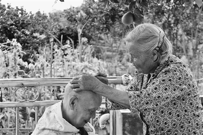 “老古,来,我背你出去,又该理发了!”7月3日上午,阳光明媚,重庆市忠县双桂镇石宝村割草湾,81岁的何光英将双腿残疾的丈夫古臣坤一下子从床头抱到了轮椅上,推到阳光下,熟练地摸出刮胡刀为老伴“刮光头”。