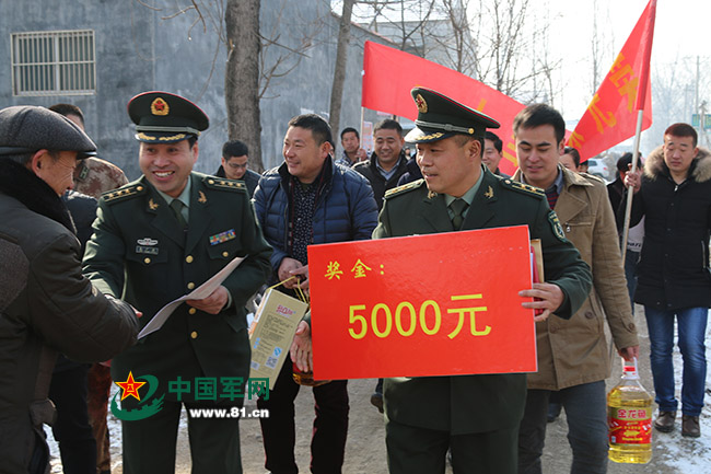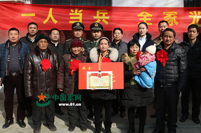 在新春佳节到来之际,为进一步激发广大官兵安心服役,献身强军实践的使命感和光荣感,2月1日上午,永城市双桥乡桑楼村鞭炮响亮、锣鼓喧鸣,人武部政委朱广昌、解放军驻许昌某部副参谋长刘月岭带领市民政局、双桥镇等部门工作人员,带着立功受奖喜报和慰问品、慰问金,来到荣立二等功的现役士官曹宏宇家庭进行走访慰问。