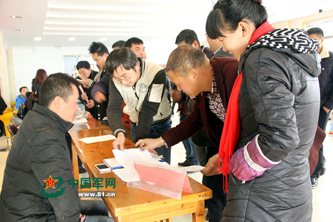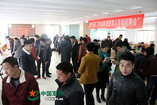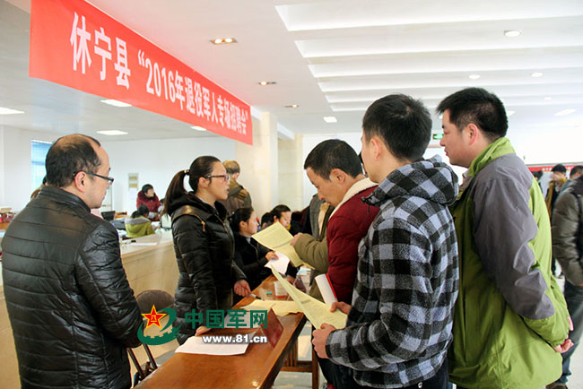 2月18日,在安徽省休宁县人力资源市场招聘会场内人头攒动,热闹非凡,求职意向的退役士兵正在仔细查看用人单位的招聘条件。这是该县人武部、人社局和民政局联合举办的2016年退役士兵专场招聘会。当日,近600名退役士兵经过推荐和洽谈,有150人与招聘单位达成了初步就业意向。