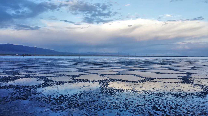 茶卡盐湖在约20万平方公里的柴达木盆地中。夹在祁连山支脉完颜通布山和昆仑山支脉旺尕秀山之间,湖面海拔3100米,东西长15.8公里,南北宽9.2公里,呈椭圆形,总面积105平方公里,相当于16个杭州西湖一样大。