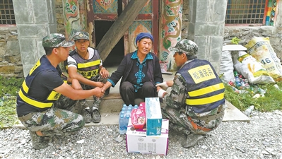 8月11日,正在抗震救灾的松潘县民兵来到漳扎镇沙坝村,为71岁老人张玉秀送去生活用品。韦龙林摄