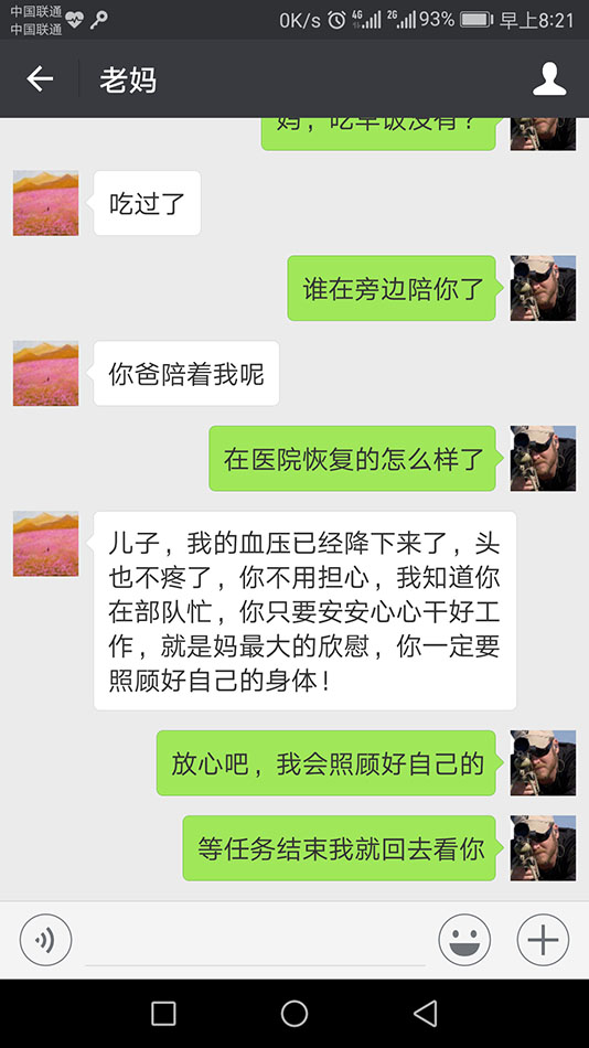 母亲赵桂芬(贤妻良母):儿子,我的血压已经降下来了,头也不疼了,你不用担心,我知道你在部队忙,你只要安安心心干好工作,就是妈最大的欣慰。你一定要照顾好自己的身体。