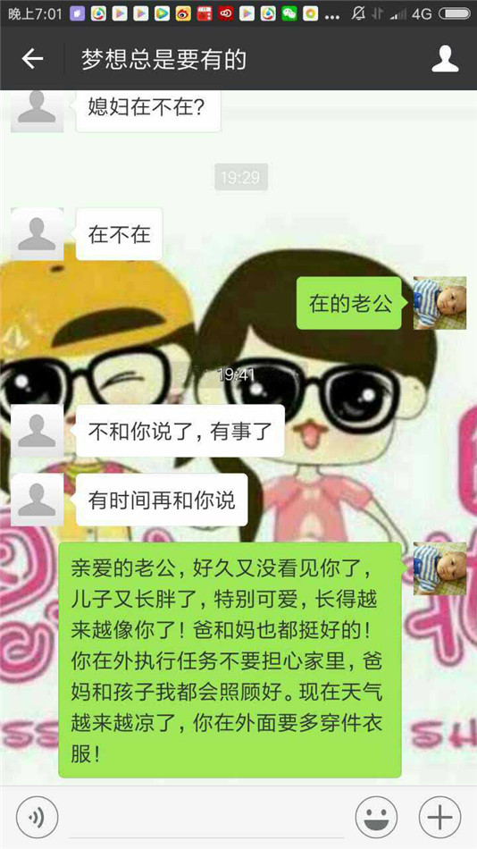 妻子李刘佳(孝敬父母、任劳任怨的好军嫂):你在外执行任务不要担心家里,爸妈和孩子我都会照顾好的,现在天气越来越凉了,你在外要多穿件衣服。
