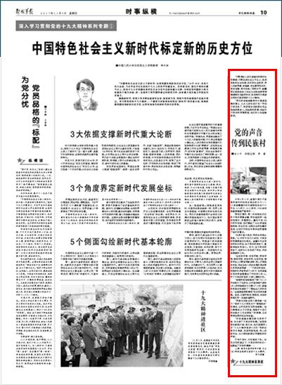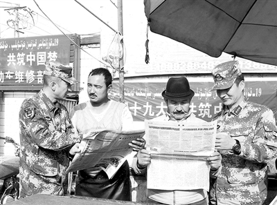 上图:维吾尔族军官阿不都·万力(左)和战友给群众宣讲十九大精神。何方龙摄