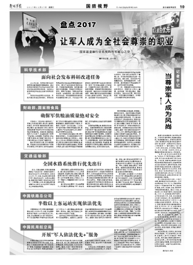 “让军人成为全社会尊崇的职业。”这句话,不只是写在报告上的暖心话语,而已成为各级各部门的行动自觉。今年以来,国家有关部委和行业系统紧紧围绕《构建完善军人荣誉制度体系总体方案》要求,紧跟军改进程,积极贯彻军民融合战略思想,在服务国防、服务部队、服务官兵中主动作为、积极作为,推出了许多利军利兵之举,全力支持部队练兵备战,努力让广大官兵共享改革发展成果,让部队和官兵有了更多的获得感、幸福感。请关注今日出版的《解放军报》的文章——