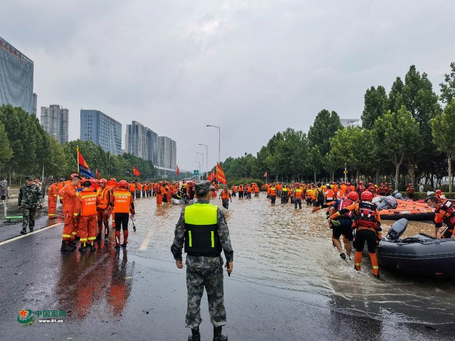 人民子弟兵闻令而动,日夜兼程,紧急驰援。他们高呼着“首战用我,用我必胜”的口号,在豫州大地镌刻下“人民至上,生命至上”的铮铮誓言。救援直升机腾空而起,军车、冲锋舟、救护车、大巴车集体出动,一场水陆空护航生命的大转运拉开帷幕。