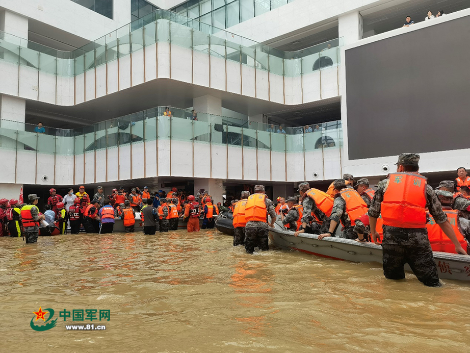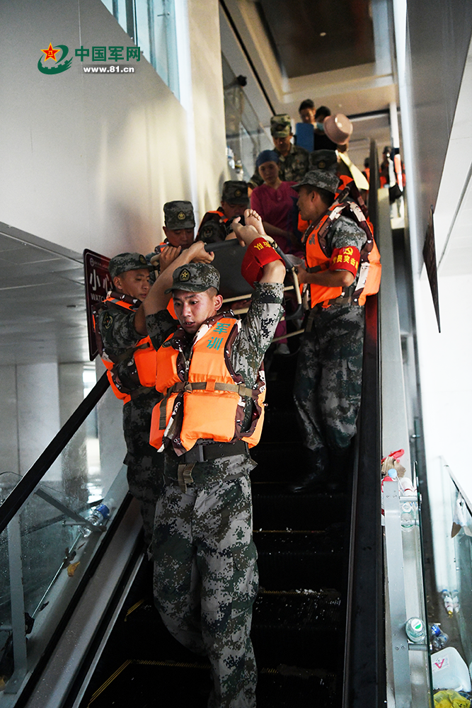 绿色的军装、橘色的马甲、清脆的哨声、震天的呼号,在暴雨中形成了新的洪流,医护人员和病患自发集聚到二层平台,用掌声向“生命使者”致敬!来自新乡的李大娘眼含热泪不断行礼:“子弟兵来了,我们心安了!”