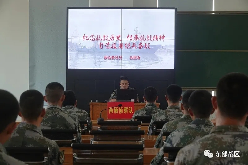 为纪念中国人民抗日战争胜利76周年,东部战区陆军海防某旅船艇大队两栖侦察队全体官兵进行了一次“铭记抗战历史、投身强军实践”专题教育活动。