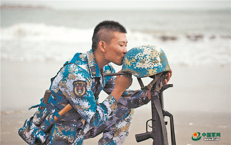 海军陆战队某旅退伍老兵贺少暄,深情亲吻陪伴了自己两年的头盔。高 坤摄