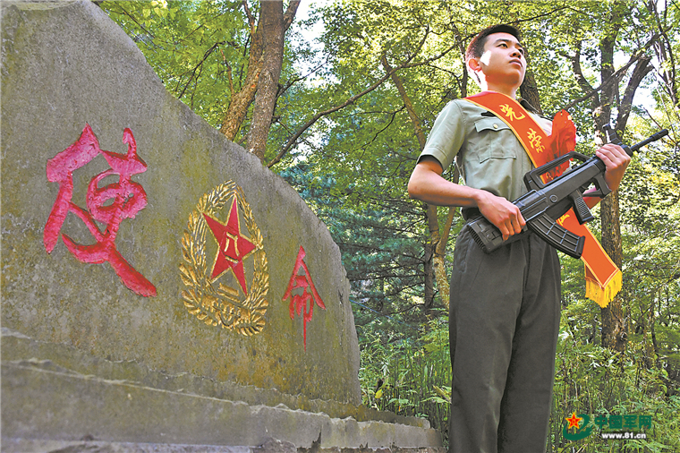 沈阳联勤保障中心某仓库组织退伍战士重温“强军石刻”,引导大家坚定信念、永葆初心。图为一名退伍老兵与“使命”碑合影留念。袁 淼摄