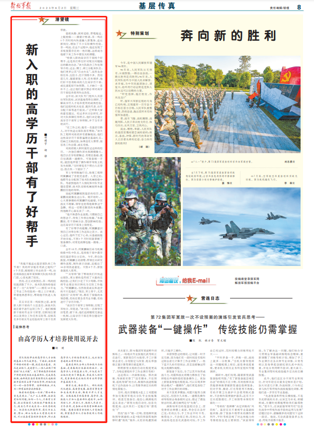 基层是部队全部工作和战斗力的基础,是离备战打仗最近的地方。让高学历人才到基层工作,不仅是为了让他们更加了解基层、养成军人的作风,更重要的是让他们用专业所学提升基层战斗力。