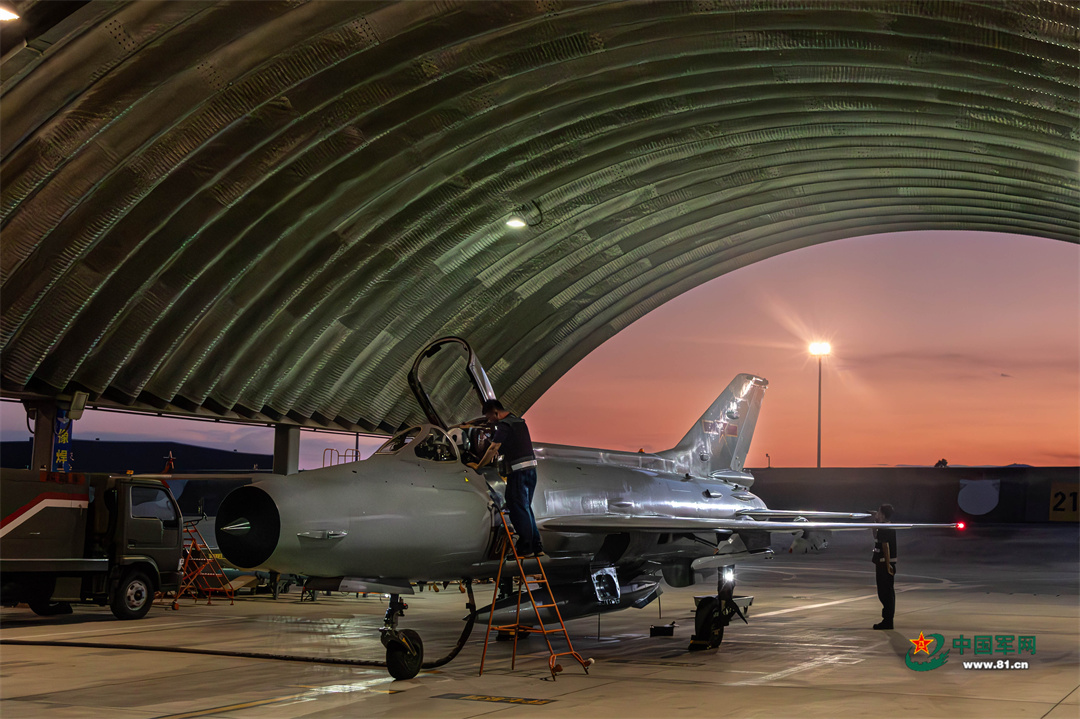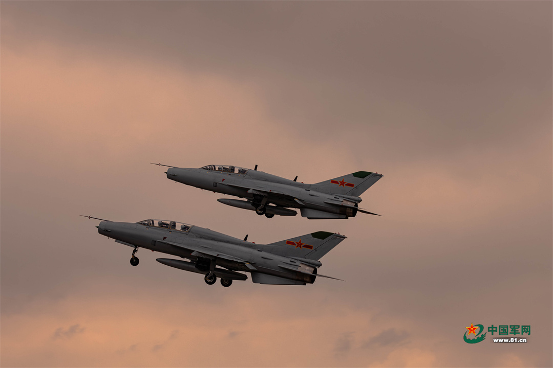 近日,南部战区空军航空兵某旅组织跨昼夜飞行训练,落日余晖下战机编队接续滑出,呼啸升空。编队到达任务空域后,飞行员展开对抗空战、夜间编队等课目训练,检验飞行员技战水平,锤炼部队作战能力。