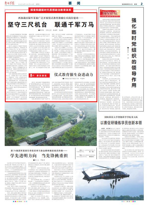仪式教育催生官兵爱军精武豪情。近期,该旅在高原参加一场信息保障训练,官兵克服重重困难,集智攻关高寒高海拔条件下信息保障难题,确保一道道作战指令精准传达。