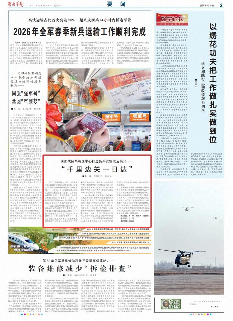 近日,川西某县火车站,一群身着迷彩、胸戴红花的新兵整齐列队,在军代表引导下通过绿色通道登上铁路专列。一个多小时后,他们抵达附近机场,乘坐民航包机直飞新疆。从川西腹地到西北边陲,这批新兵不到一天便抵达军营,实现了“千里边关一日达”。这是西部战区某调度中心打造铁空联运模式,给新兵投送带来的显著变化。