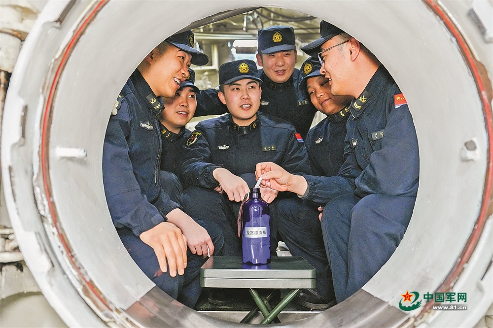 黄海某海域,风急浪高。北部战区海军某部一艘正在执行任务的潜艇内,一个深蓝色塑料瓶,正在各舱室、各战位艇员手中依次传递。