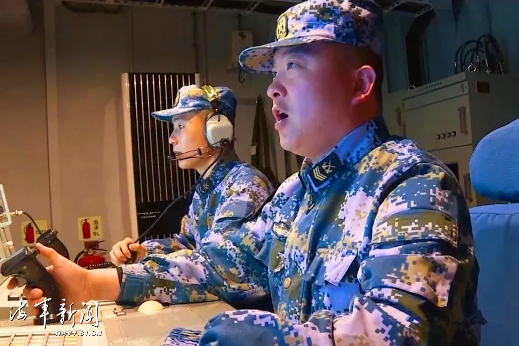 黄冈舰作战指挥室内荧屏闪烁,一道道指令传向各战位,声呐兵密切配合,对水下可疑目标进行仔细识别,“敌”潜艇踪迹很快被锁定。“舰艏深弹准备,打击目标×××”……经过一番鏖战,编队成功消除水下威胁。