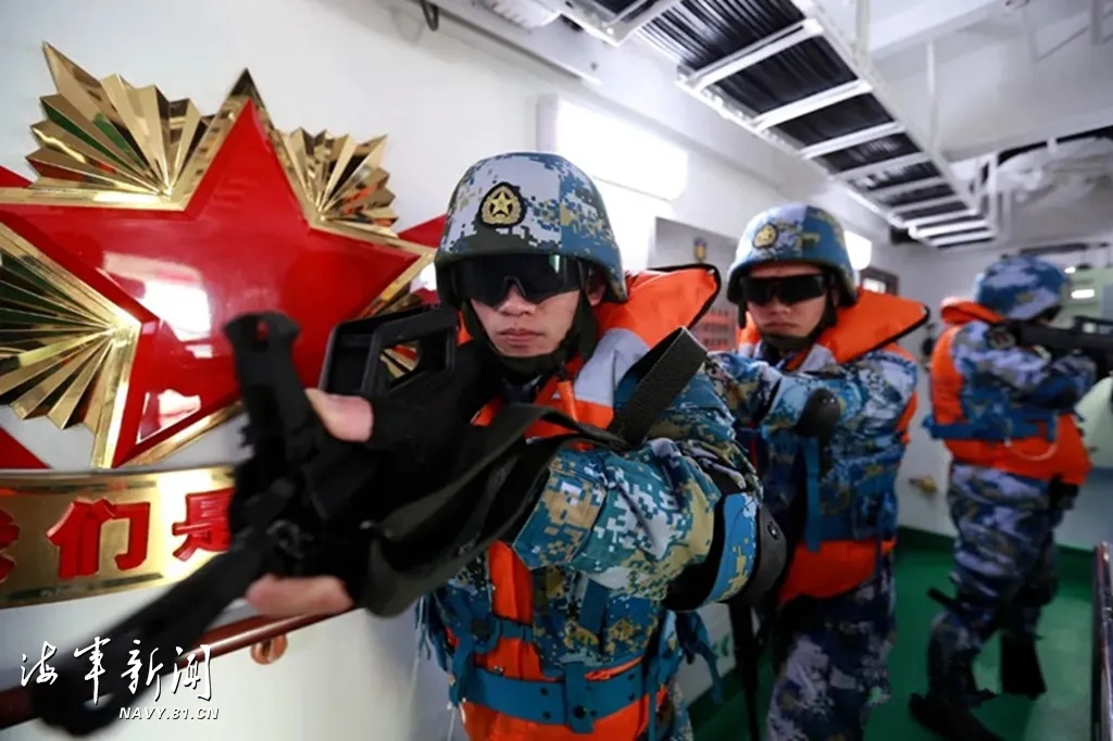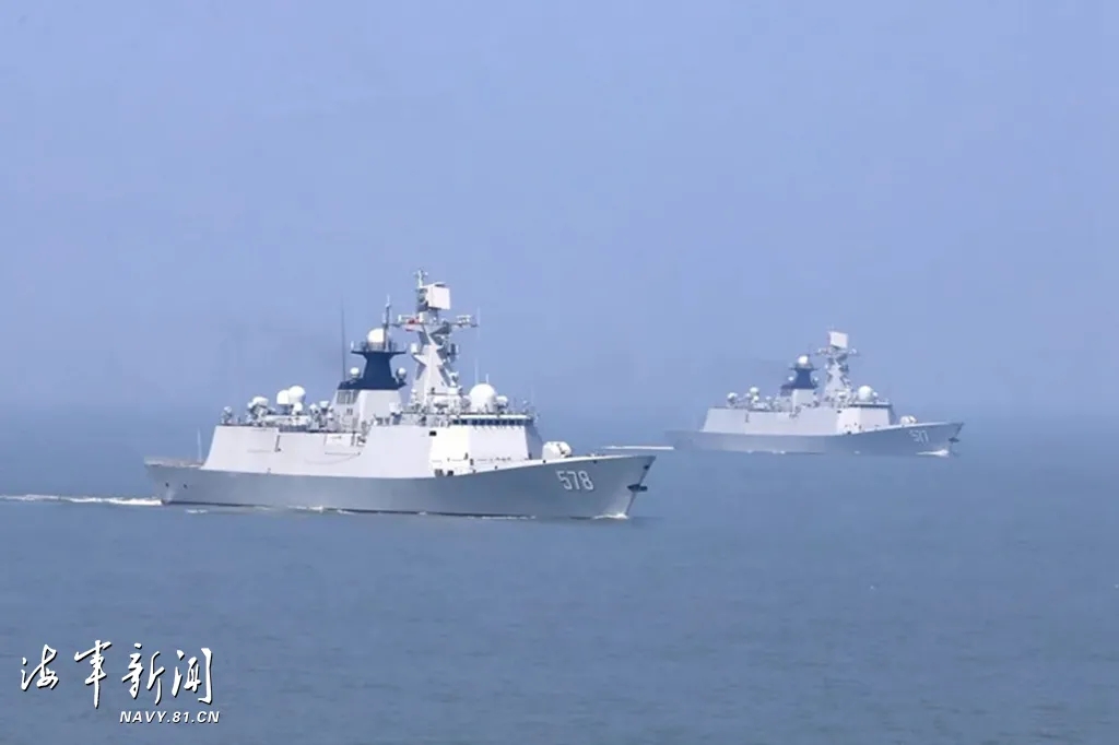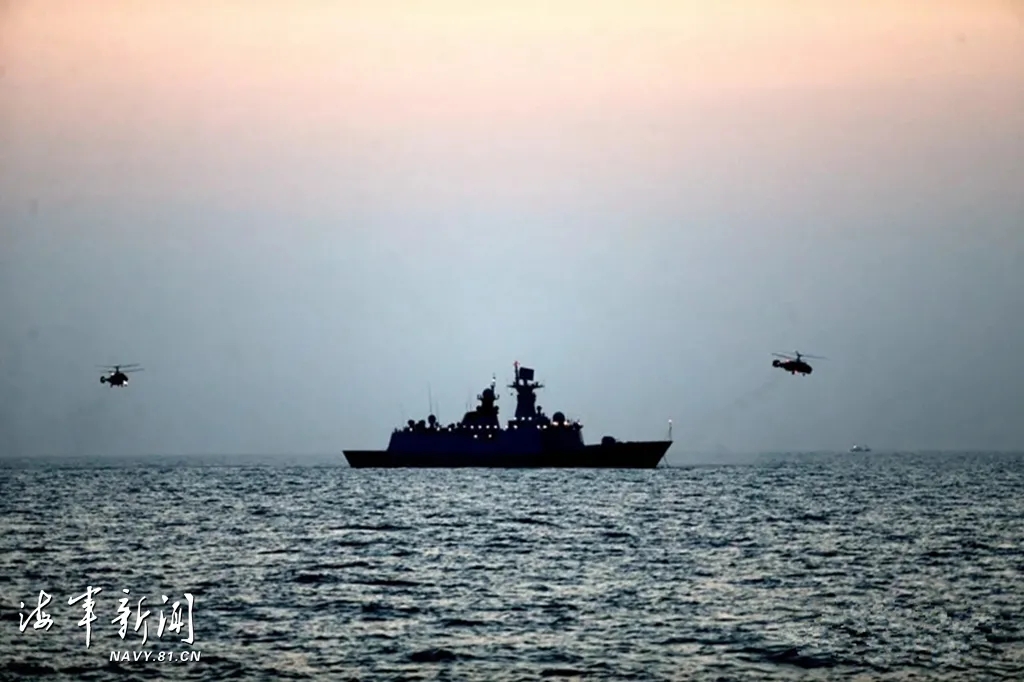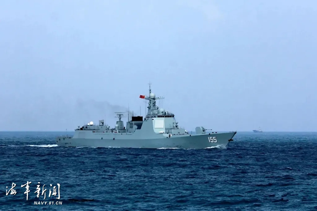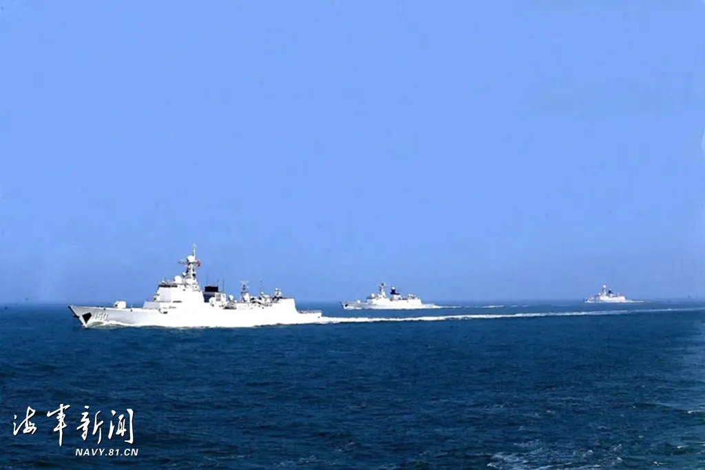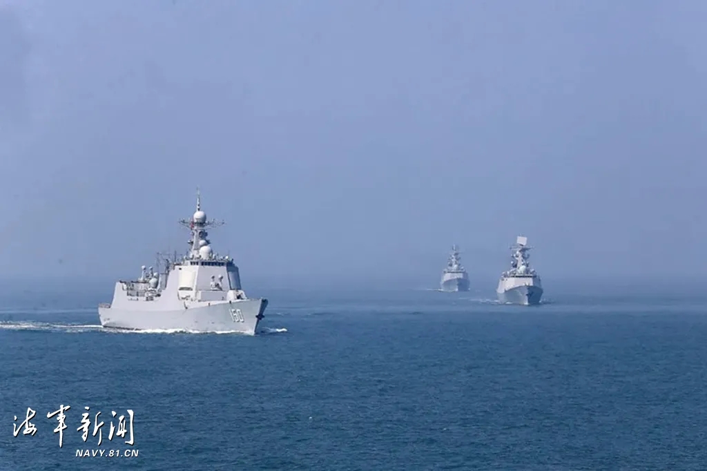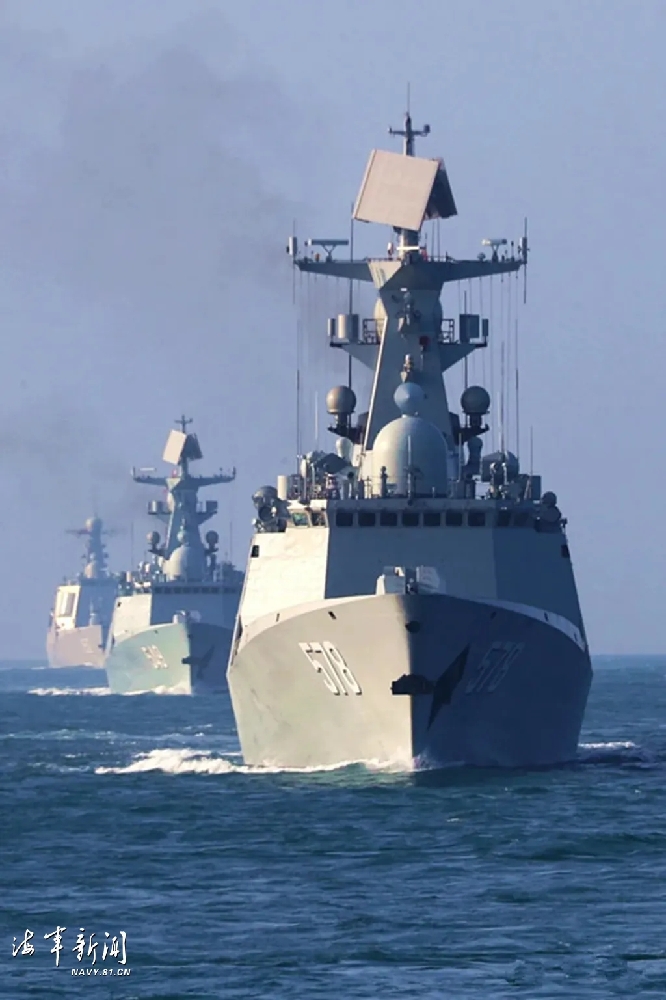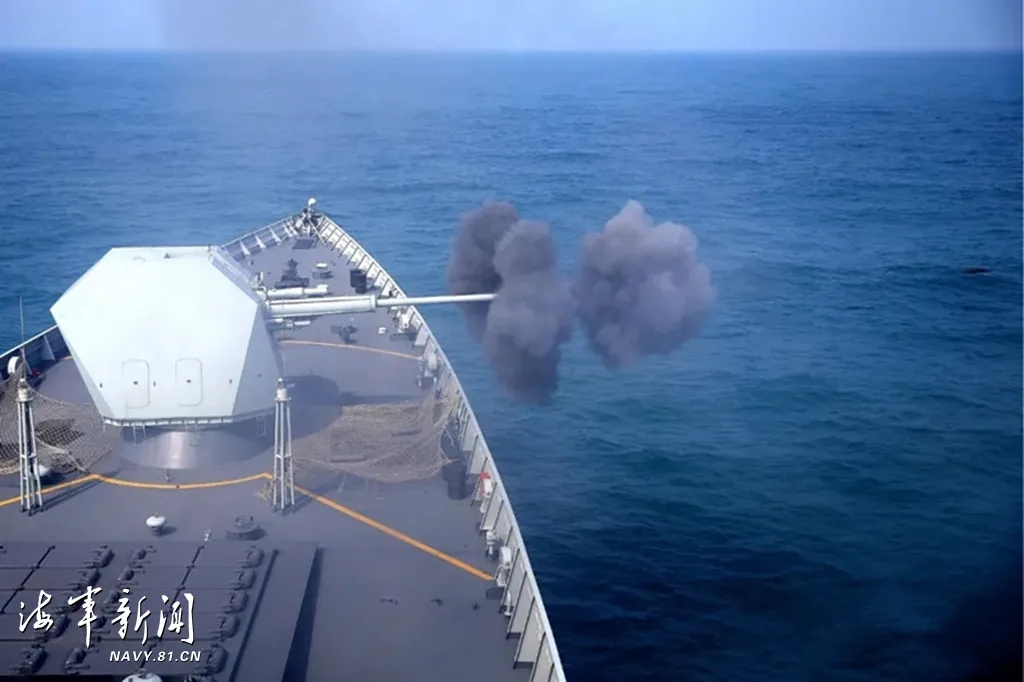 近日,东部战区海军某驱逐舰支队南京舰、黄冈舰等5艘舰艇组成编队奔赴某海域进行实弹射击训练。