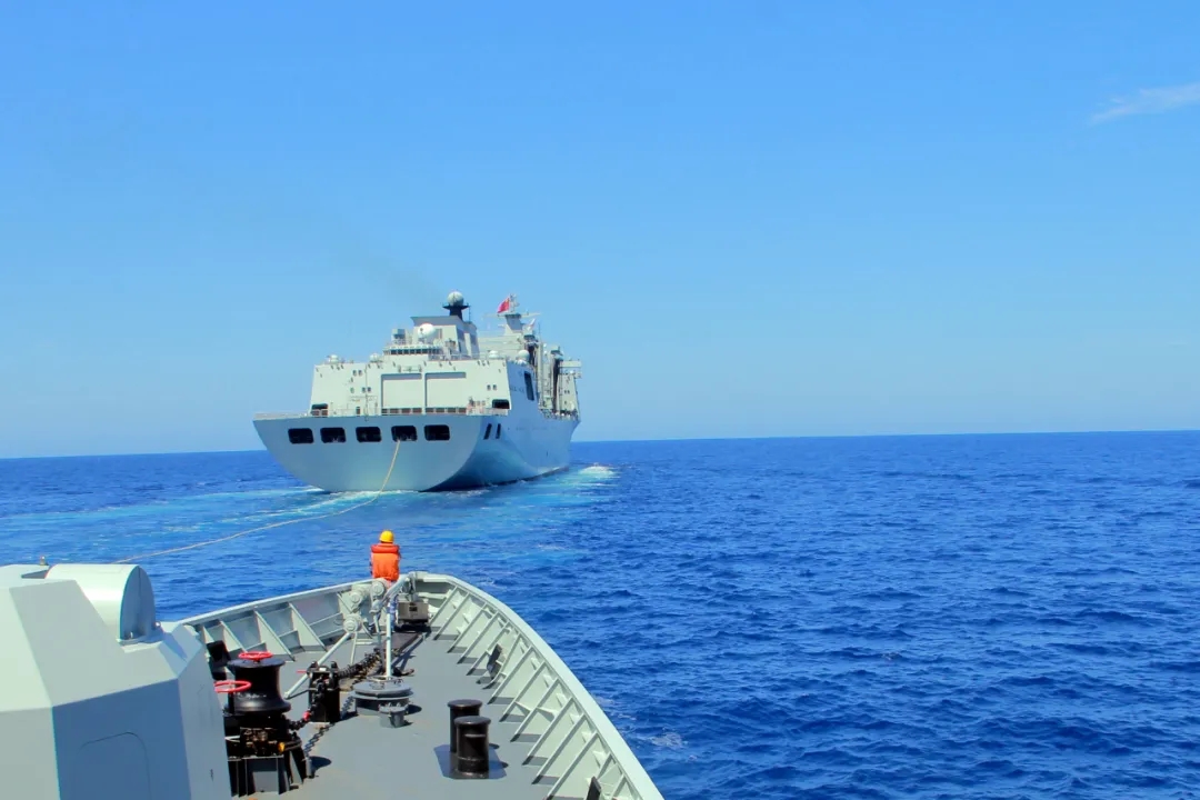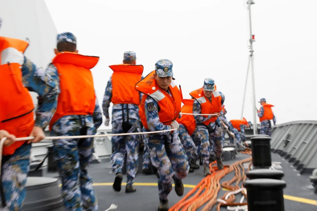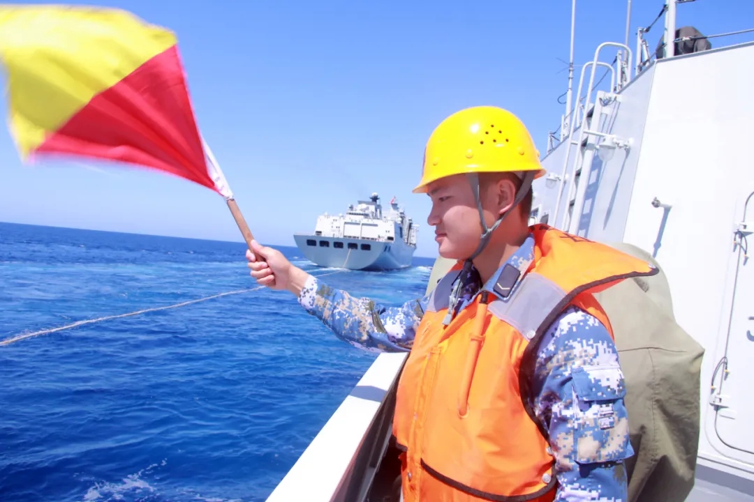 刚解除战斗部署,各舰又接到新的命令,要求到指定海域进行油水补给,官兵立即调整航向,高速机动前行……