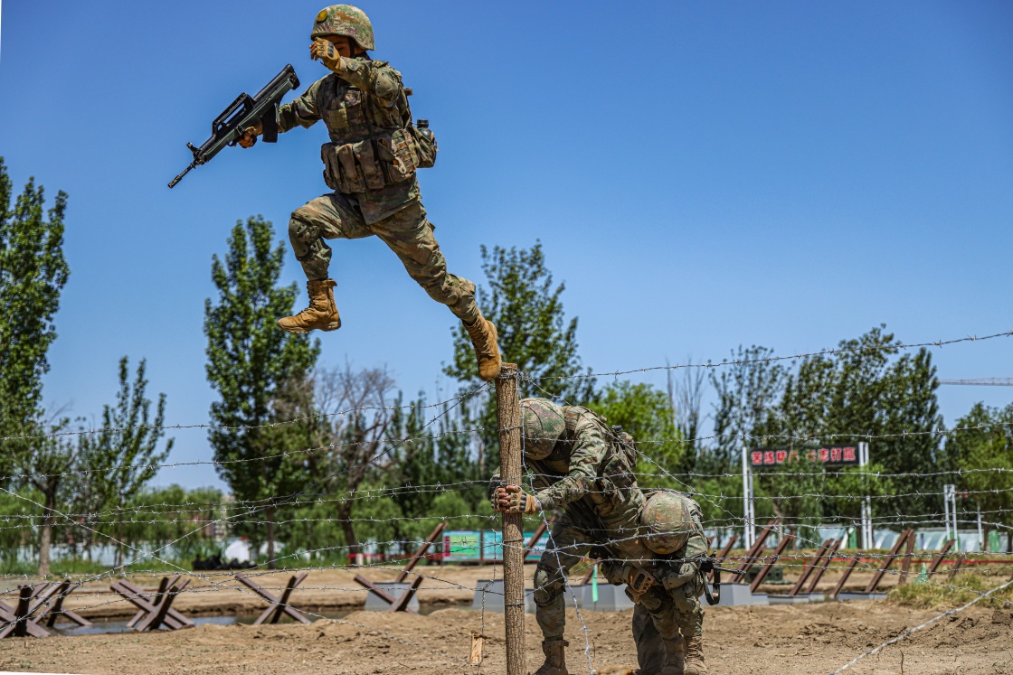 中部战区陆军第81集团军某旅“松骨峰特功连”组织官兵进行跨过铁丝网训练(2023年6月9日摄)。新华社发(姜慧鑫 摄)